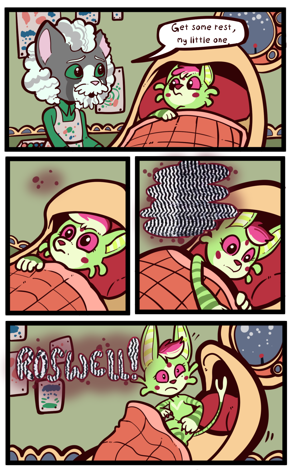 Panel 1: Senior has tucked Roswell into a bean-shaped bed. They are inside a green-walled room, with round a round window that shows the stars and radio tower outside. There are child-like paintings tacked onto the wall, and the bottom of the wall is lined with semi-circular vents. Senior says, "Get some rest, my little one." Roswell looks at him with big eyes.