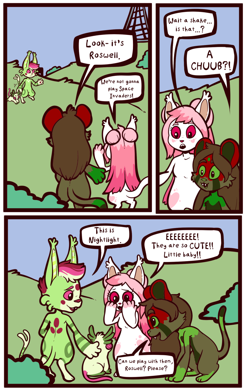 Panel 1: Roswell is walking toward two other child Nyans, waving and lading Nightlight. The brown and green Nyan (a cameo of MxxyMerlin) says, "Look- it's Roswell." The white and pink Nyan (a cameo of ChibiTea) calls to Roswell, "We're not gonna play Space Invaders!"