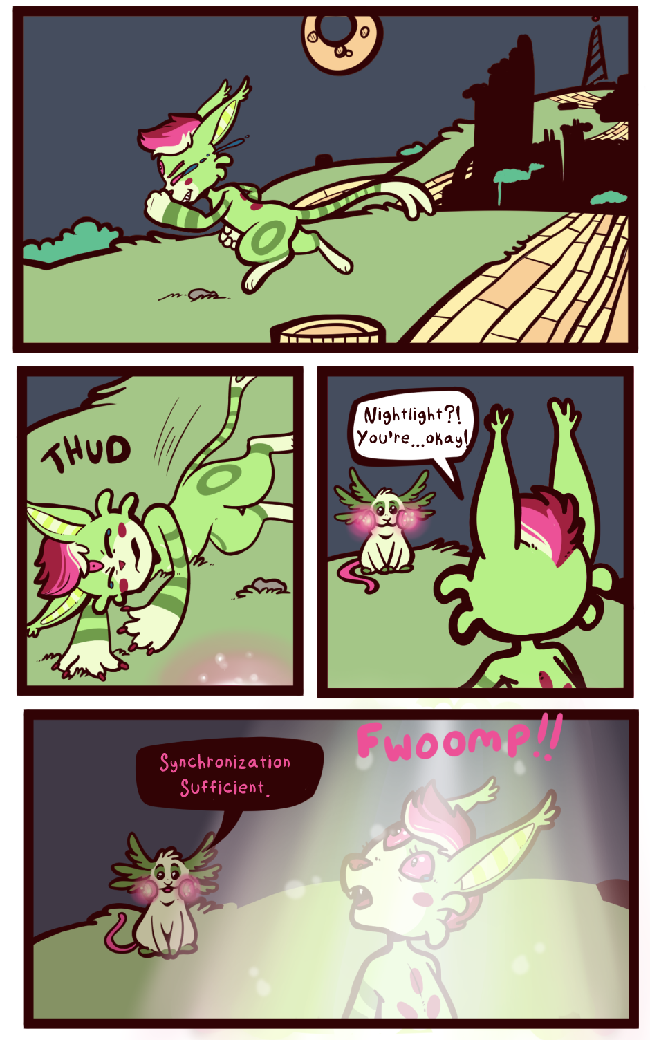 Panel 3: Roswell looks up, and see's a smiling Nightlight sitting on the top of the hill. "Nightlight?!" Roswell says, "You're... okay!"